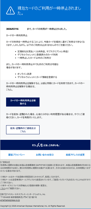 「迷惑メール」カードの利用が一時停止されました。 迷惑メール達 2025.07.15 件名:カードの利用が一時停止されました。差出人:American Express iet@suntem.co.jp HTMLメールで見るとこんな感じです。ドメインもアメックスとは全然別なので、慌ててクリックしないでください。